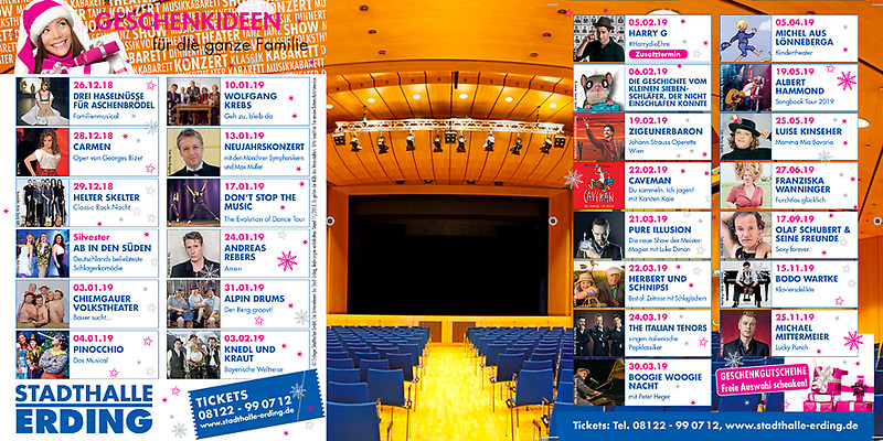 Die Stadthalle Erding steht als Veranstaltungslocation für das größte Raumangebot im Nordosten von München. Das renommierte Haus bietet in elegantem Ambiente von professioneller Tagungstechnik bis hin zur leistungsstarken Gastronomie alles für Kongress, Tagung, Kultur und Events aller Art für 5 bis 1.500 Personen. Mit einem bunten Programm aus Kabarett, Musical, Show, Theater und mehr bietet die Stadthalle Erding vielfältige Veranstaltungen.